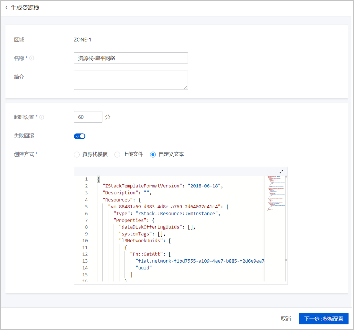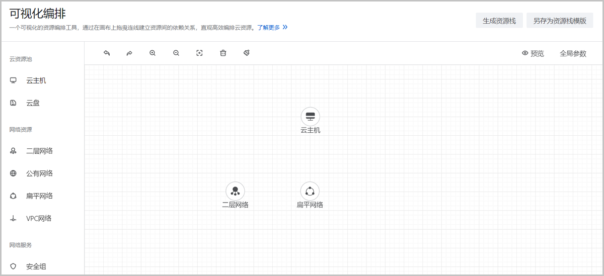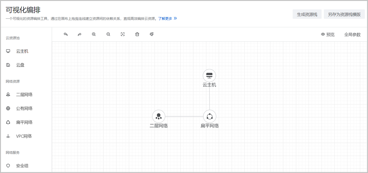 使用可视化编排,可以更直观高效地创建资源栈模板以及显示资源栈结构。打开可视化编排,通过拖曳资源到画布中适当位置,连线创建资源间的依赖关系,并输入需要的参数,即可快速创建资源栈模板,高效编排云资源。