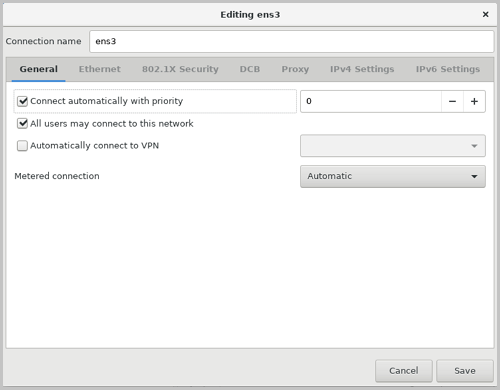 ens3配置界面,点击General > Connect automatically with priority (0) > Save,修改网卡自动激活。