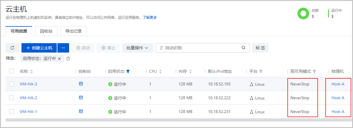 场景假定:用户在物理机Host A上部署了3台云主机用于运行重要业务,并使用Ceph主存储存储云主机数据。要求物理机Host A与Ceph存储网失联时,所有3台云主机迁移至其他物理机,以保障业务高可用。此场景下,可将这些云主机高可用模式均设置为NeverStop,且设置存储网络连接状态故障时触发迁移,并确保云平台内物理机资源充足。